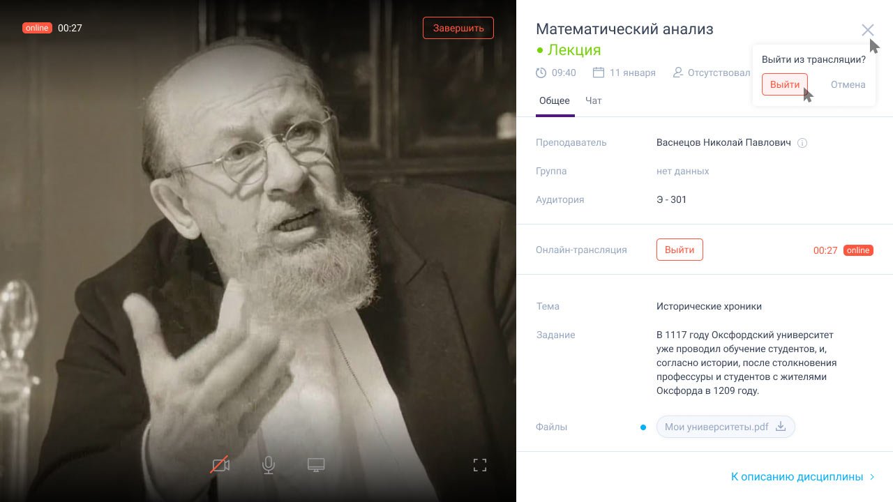 Преподаватель выступает модератором трансляции, видит студентов вживую и может «вызвать» к интерактивной доске.