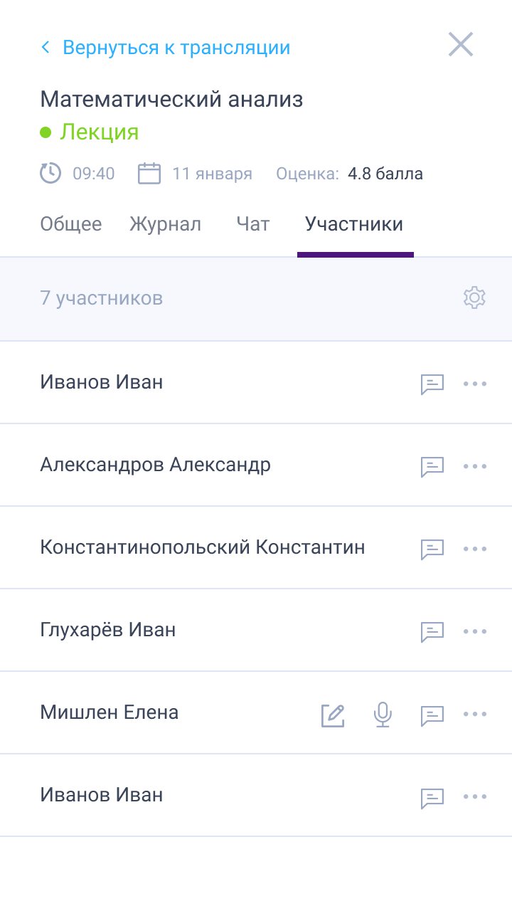 При клике на конкретное занятие можно получить его детальную информацию и открыть чат с преподавателем и группой. В чате студент может напрямую задать свои вопросы преподавателю, история чата сохраняется. Преподавателю доступен список ученников занятия, возможность поставить им оценки и многое другое, чтобы провести урок.
