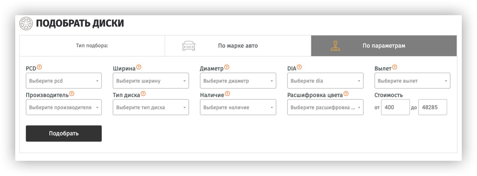 Диски, шины и автотовары на сайте подобираются по модели автомобиля или по параметрам товара.