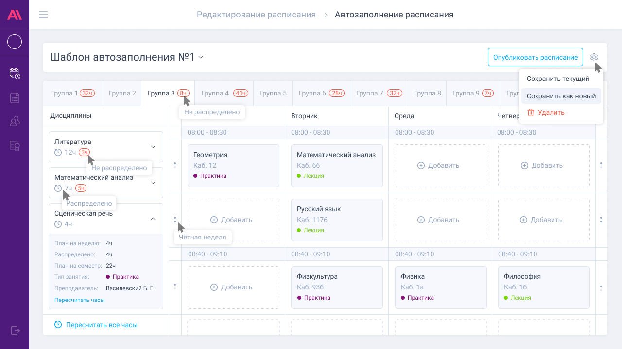 Создавать расписание — вручную или с помощью автоматических алгоритмов.