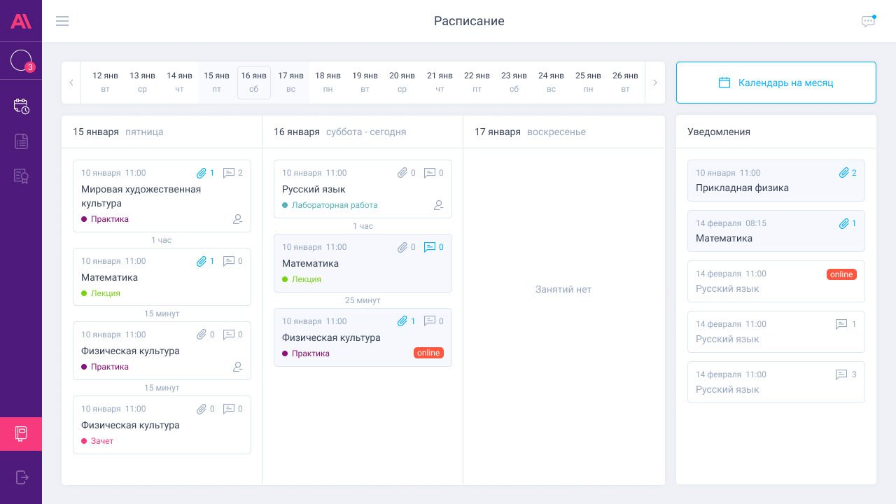 Преподаватели и студенты начинают работу со страницы расписания. На ней расположен список занятий на ближайшие три дня. Без дополнительных действий по каждому занятию доступны:
