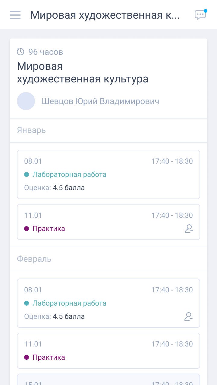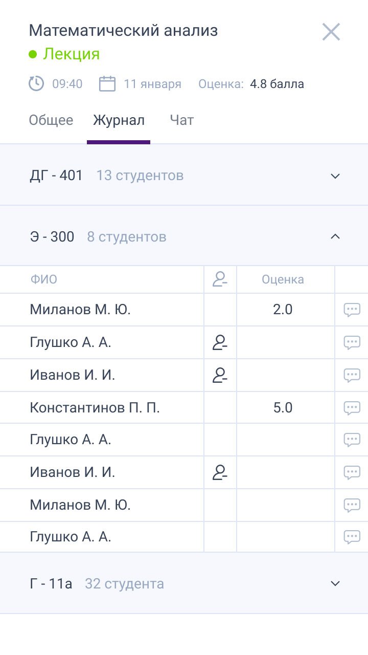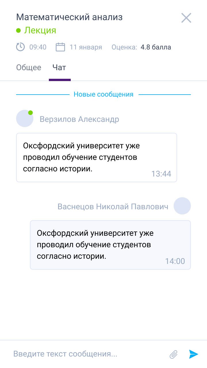 При клике на конкретное занятие можно получить его детальную информацию и открыть чат с преподавателем и группой. В чате студент может напрямую задать свои вопросы преподавателю, история чата сохраняется. Преподавателю доступен список ученников занятия, возможность поставить им оценки и многое другое, чтобы провести урок.