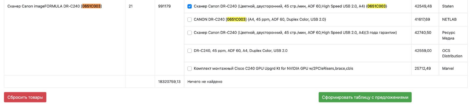 При формировании КП, по умолчанию, выбрана самая дешёвая позиция наиболее подходящего товара, однако можно выбрать вручную любую другую. Это нужно, если, например, какой-то поставщик не готов поставить товар здесь и сейчас. При каждом таком изменении будет перерасчитана маржа. Чтобы сгенерировать КП от выбранного юридического лица достаточно нажать одну кнопку.
