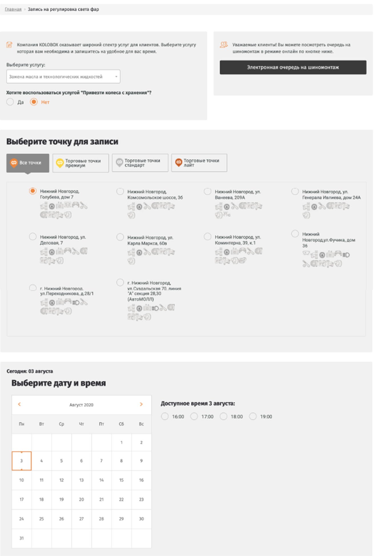 При записи на услуги учитываются выходные, а также рабочее время постов и услуг у каждой точки каждого партнёра. Если клиент хочет узнать, после кого он стоит в очереди, он может это просмотреть в электронном виде на сайте. Эта же очередь помогает мастерам на точках в модерировании потока клиентов.