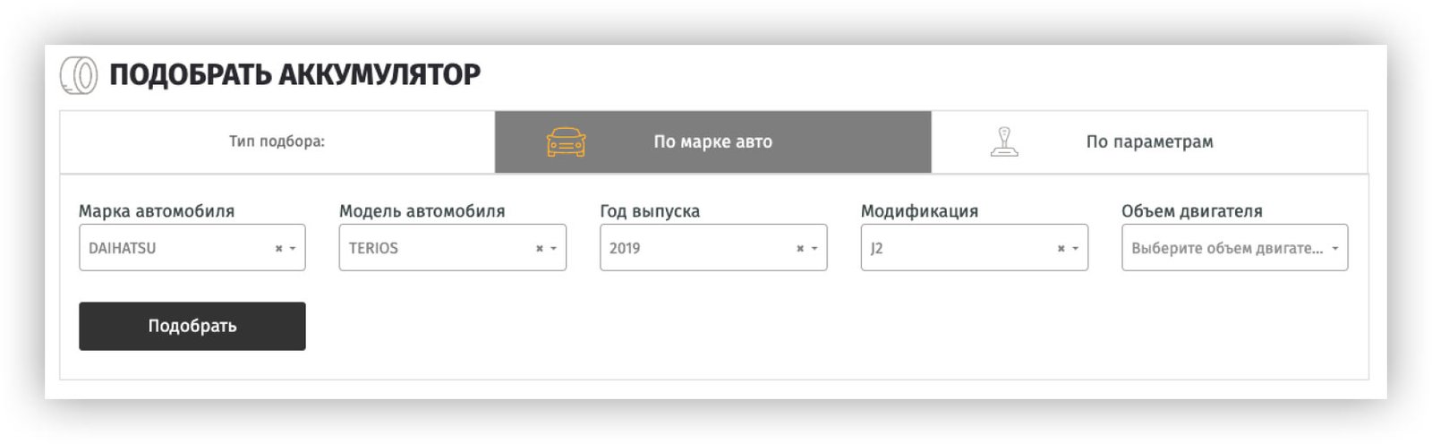 Диски, шины и автотовары на сайте подобираются по модели автомобиля или по параметрам товара.